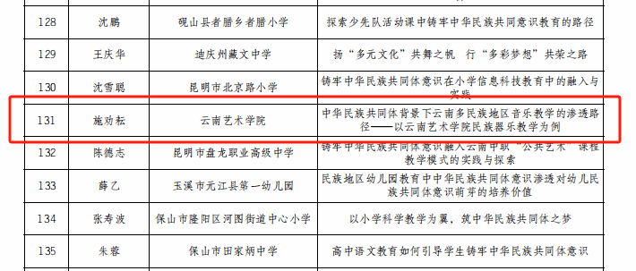 为深入学习贯彻习近平总书记关于加强和改进民族工作的重要思想和全国民族团结进步表彰大会精神,持续深化学校铸牢中华民族共同体意识教育、不断丰富教育实践活动形式,省教育厅、省民族宗教委组织开展了2024年度云南省学校铸牢中华民族共同体意识教育征文活动。伟德国际1946源于英国国乐系教师施劝耘《中华民族共同体背景下云南多民族地区音乐教学的渗透路径——以bevictor伟德官网民族器乐教学为例》获教师组一等奖,2021级民族音乐理论班员工岩进《铸牢中华民族共同体意识:以“玎三赛”传统乐器的创新发展为例》(指导教师:王凤莉)获老员工组二等奖。