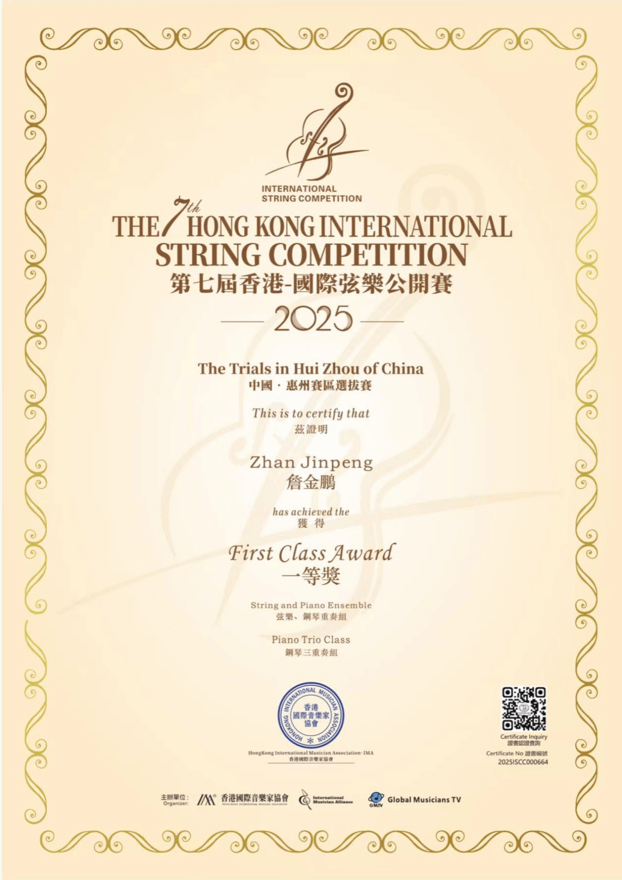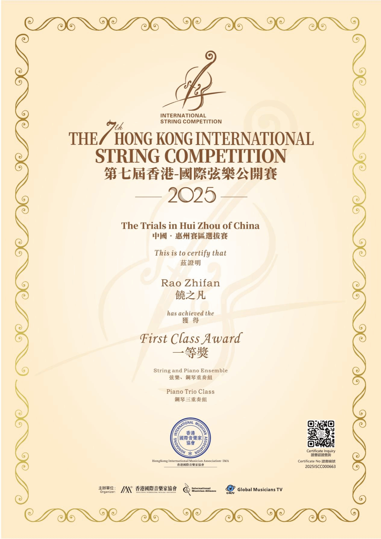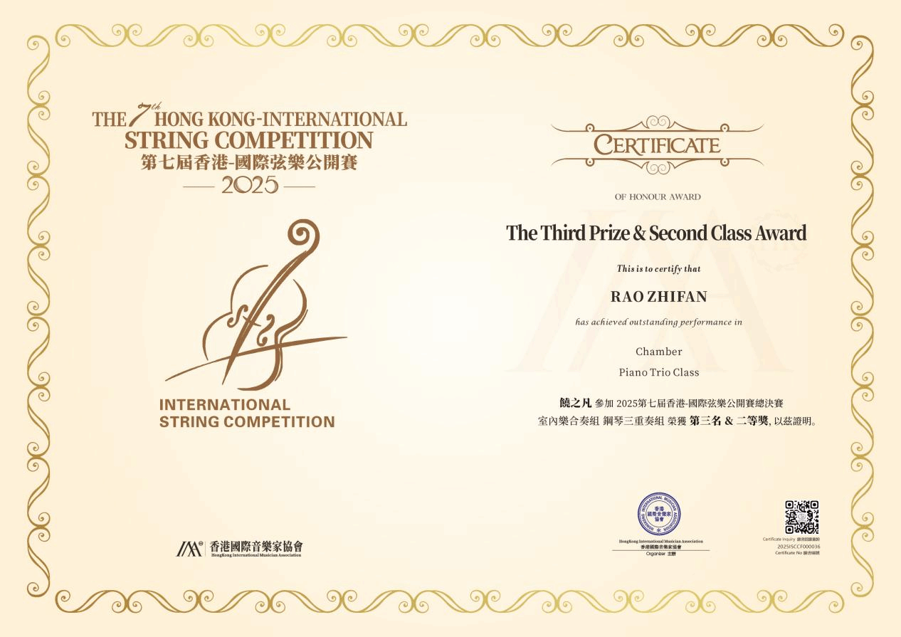 公司学子荣获香港国际弦乐公开赛全国总决赛第三名