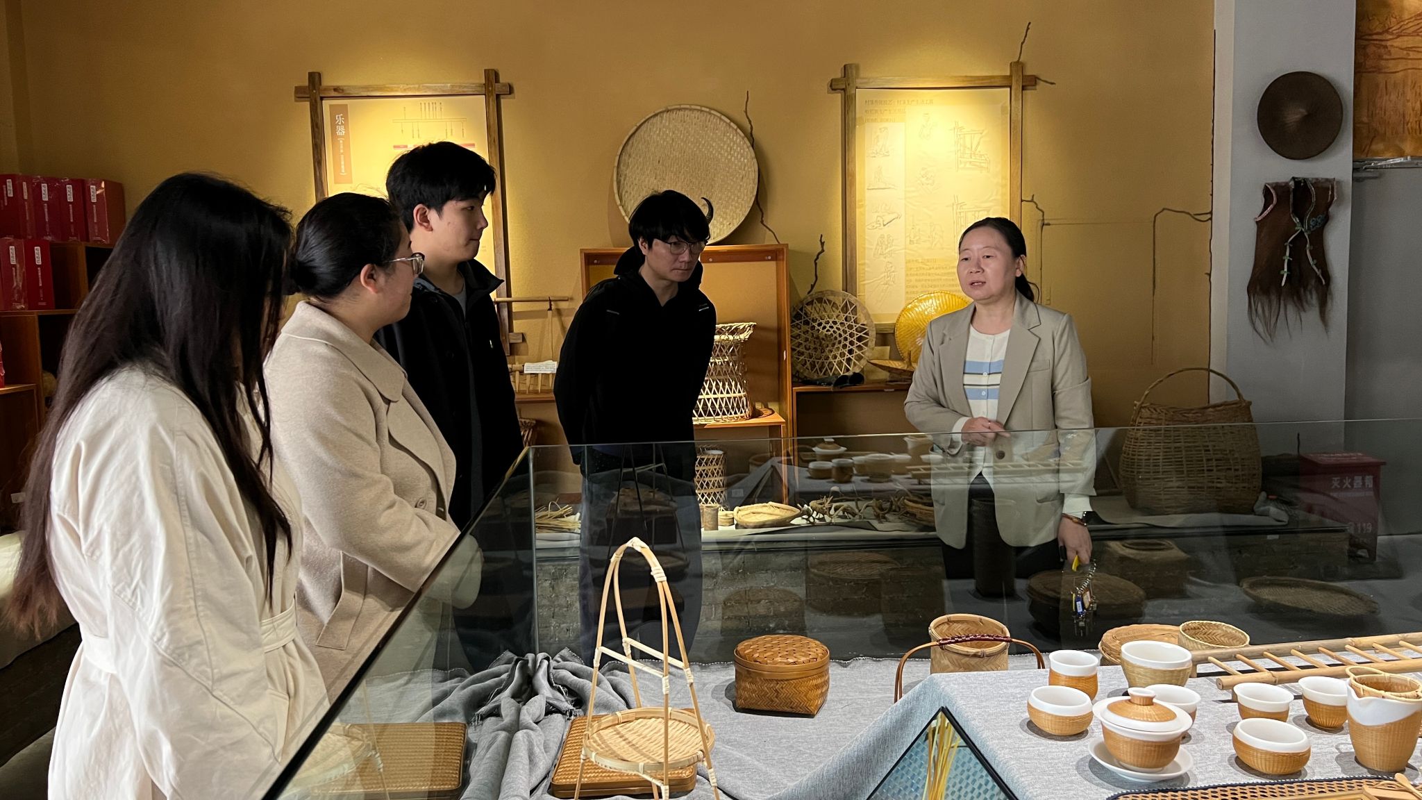 课后,团队在校方陪同下,参观了学校的非遗传承实践课程成果。在陶瓷制作工坊,团队观摩了该校师生创作的各类傣陶作品,并通过现场介绍,系统了解了从拉坯、修形到刻花、烧制的传统工艺全过程。在竹编工作室,团队欣赏了已完成的竹编工艺品,并听取了关于选竹、破篾到编织成器的完整工艺讲解。随后,团队还参观了民族乐器室,近距离观赏了哈尼族、彝族等特色传统乐器,并通过生动的讲解,了解了这些乐器的制作工艺、音乐特点及其在民族文化生活与节庆仪式中的重要作用。