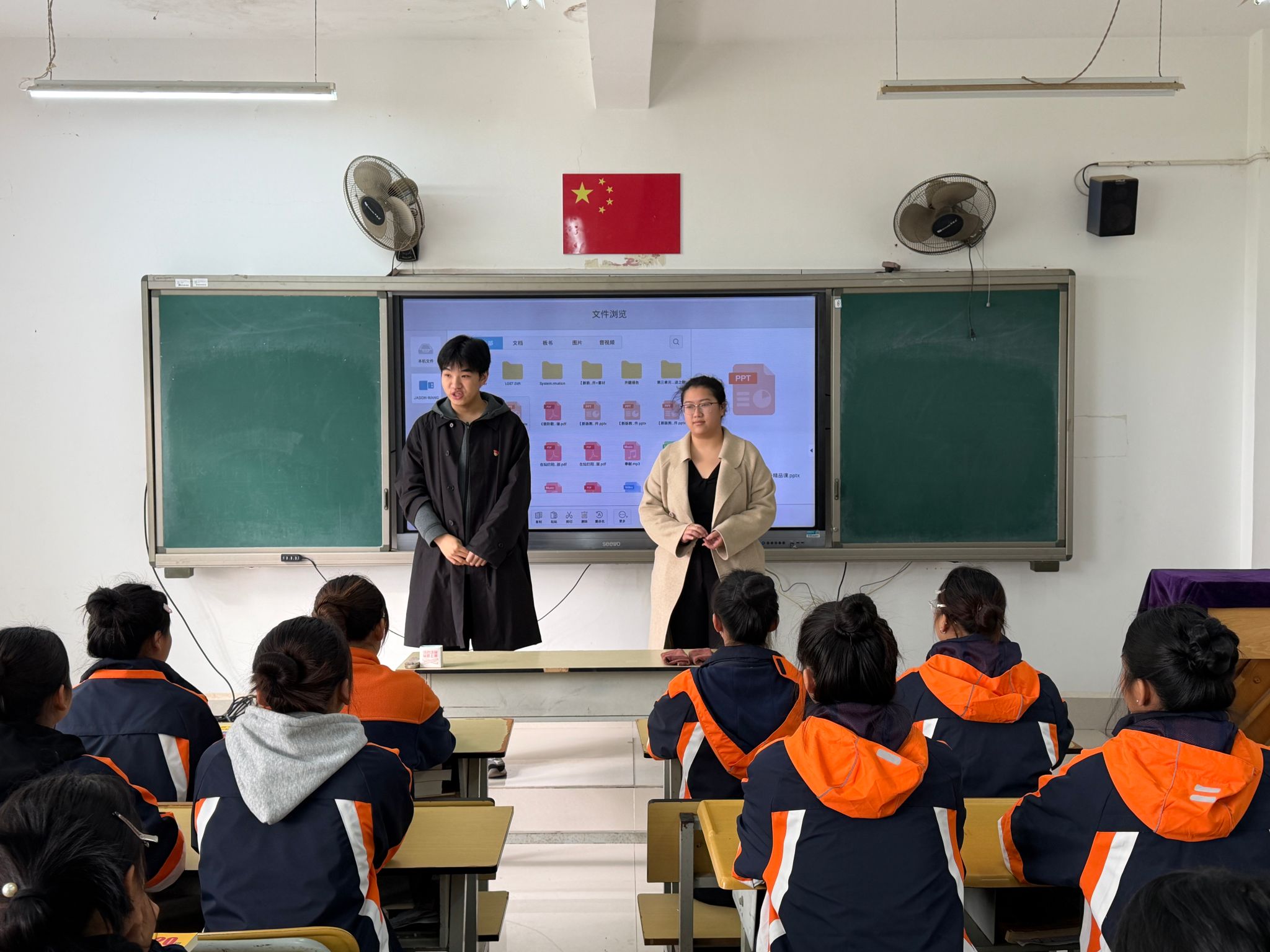 当日上午,在学校一间面朝梯田的教室里,王浚宇与陈玺竹协同完成了《友谊地久天长》的音乐教学课。王浚宇侧重于歌曲的旋律教学与节奏把握,通过钢琴伴奏进行分句教唱,引导员工准确掌握音准;陈玺竹则从歌曲的文化背景与情感表达入手,用生动的讲述和情景模拟,帮助员工理解这首经典作品所蕴含的友谊主题与跨越文化的共鸣。这种“技能传授”与“文化浸润”并行的双师模式,有效激发了员工的学习兴趣,课堂气氛活跃,不同语言的歌词在合唱中和谐交融。
