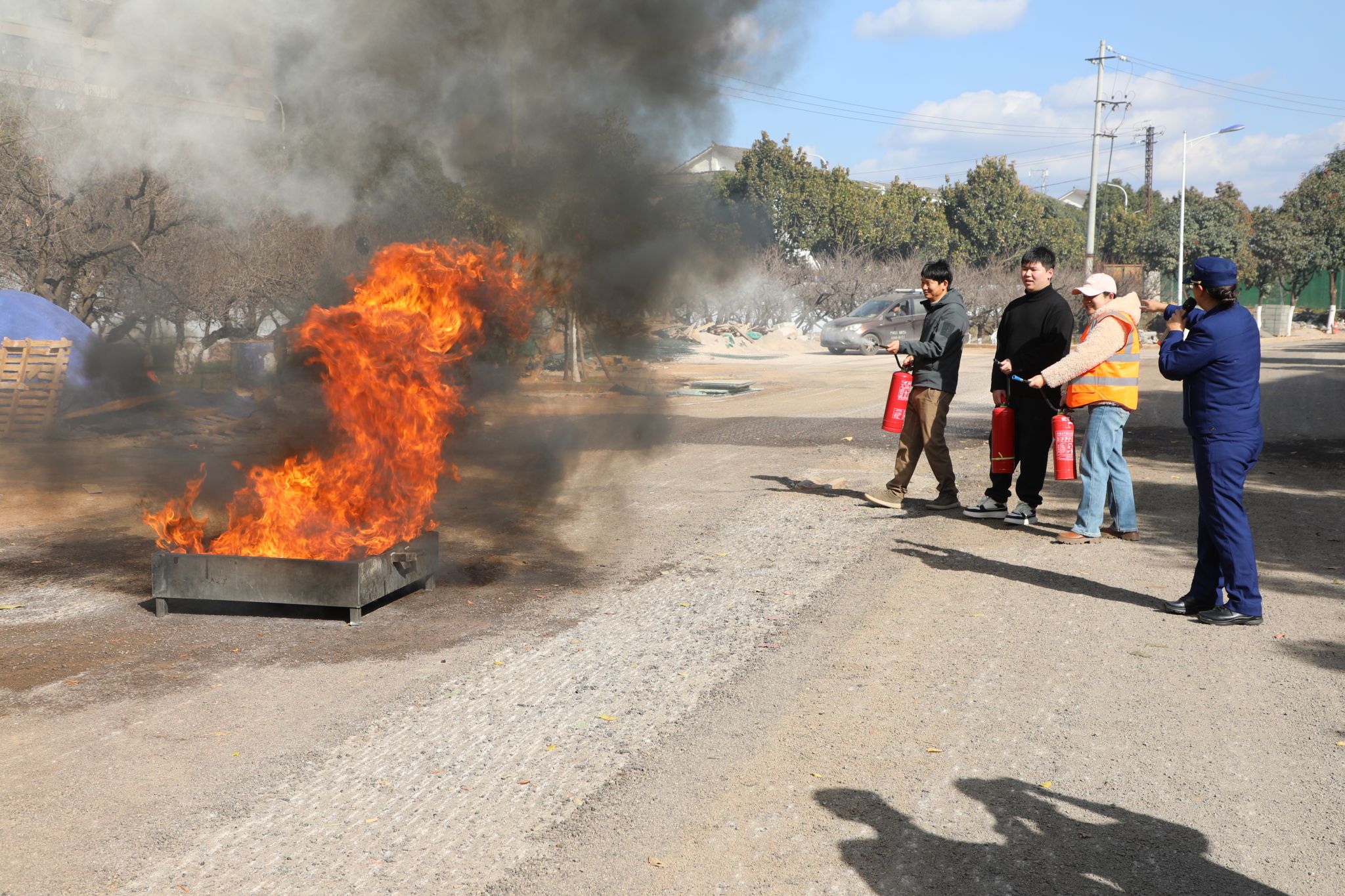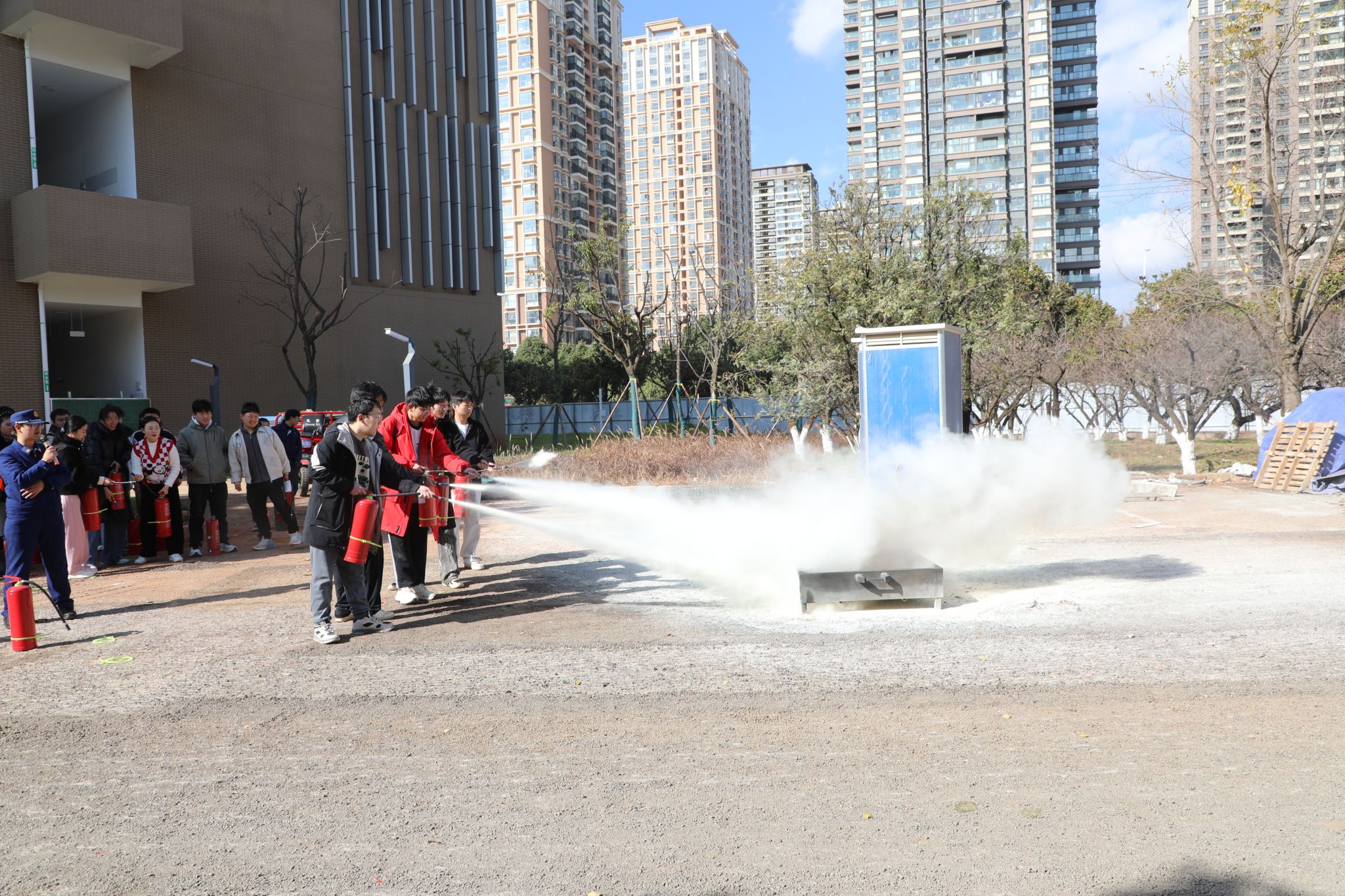 疏散演练结束后,全体参加演练的师生转移至学校5号楼旁空地参加灭火演练。消防员结合实战需求,现场开展消防器材实操教学,系统演示了灭火器、消火栓及呼吸罩的正确使用方法。在专业指导下,教师及员工代表共20余人分批次进行了灭火器实操演练,亲身体验了灭火过程,进一步掌握了消防器材的实际应用技能。