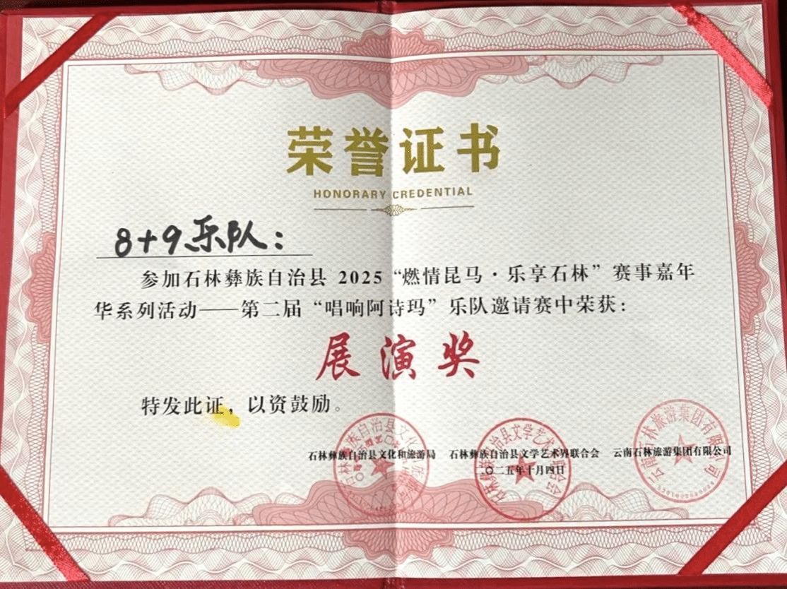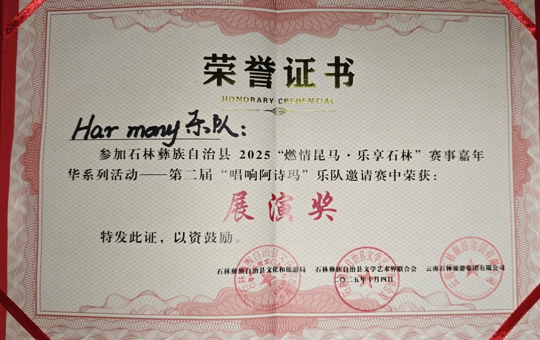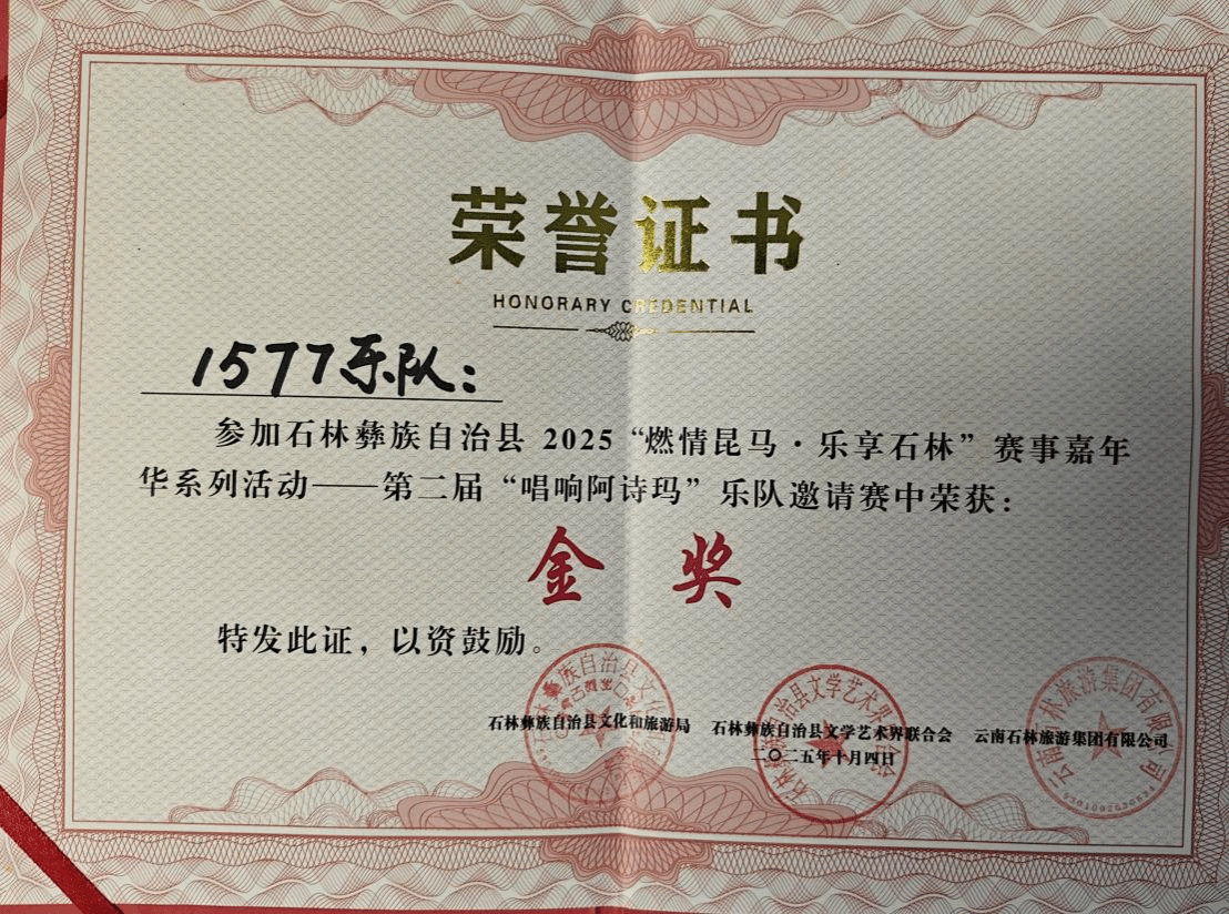 2025年10月2日至4日,“唱响阿诗玛”第二届乐队邀请赛在石林举行,本次比赛吸引了来自省内外不同地区的15支优秀乐队参赛。该项赛事是“2025燃情昆马·乐享石林”赛事嘉年华系列活动之一,由石林县文化和旅游局、石林县文学艺术联合会主办。流行音乐系三支员工乐队在比赛中用原创作品展现脱颖而出并取得优异成绩。其中1577乐队荣获金奖,Harmany乐队与8+9乐队获得展演奖。这三支获奖乐队成员分别由流行音乐系2022级和2023级员工组成,他们的参赛充分展现了我系员工在实践与舞台表演中的蓬勃活力与创造力。